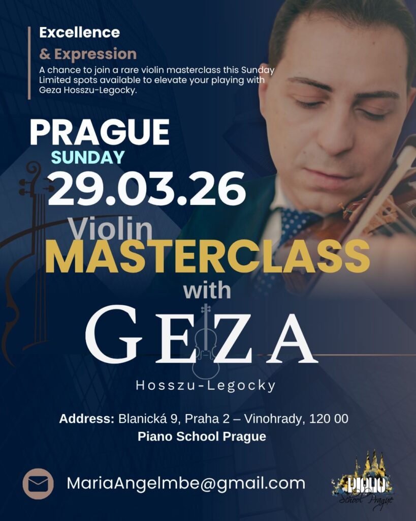 V neděli se v sále Piano School Prague koná masterclass s houslistou Gezou Hesszu-Logockym. Workshop se koná od 14h – 19h a je otevřený veřejnosti za poplatek 200 Kč.